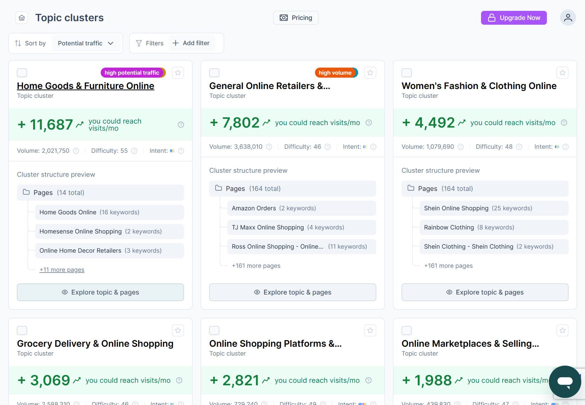 When the tool collects the data (that might take a few minutes, as the tool checks the top-ranking search engine results), you’ll get a list of topic clusters - big topics that include fewer subtopics.