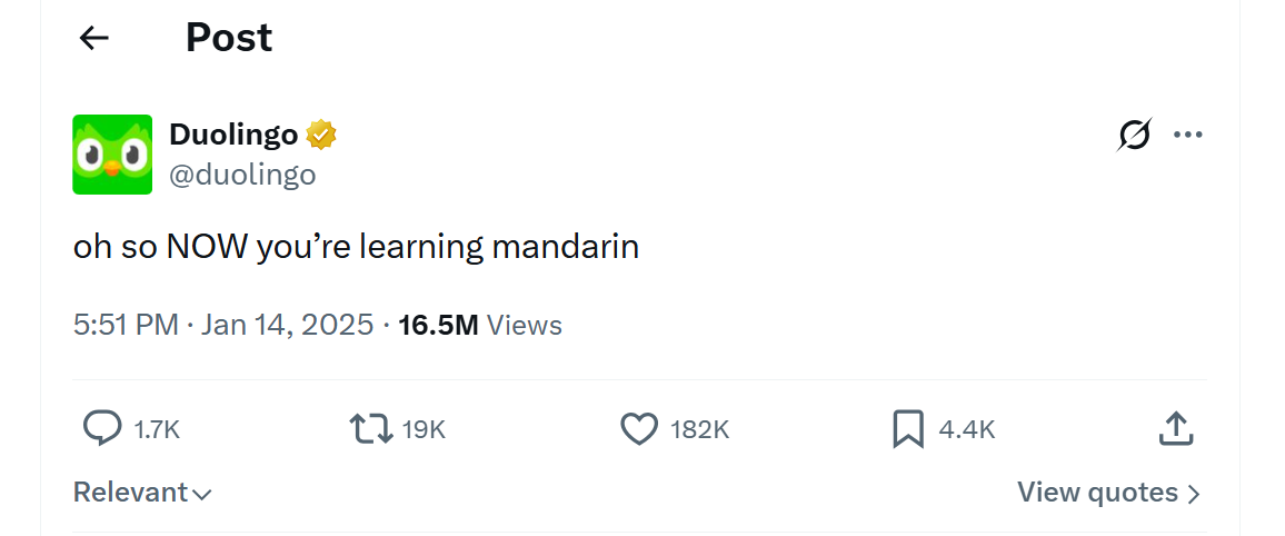The brands that get this right move fast. When the U.S. TikTok ban loomed and users started flooding to RedNote — a Chinese-language app — Duolingo's social team spotted the conversation immediately and posted a single line: "Oh so NOW you're learning Mandarin." It went viral instantly.