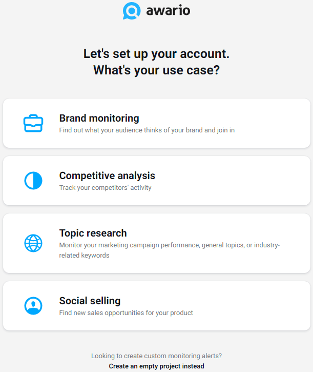 - Sign up at awario.com and create a project. You'll see four ready-made presets — pick the one that fits your goal, or start with an empty project if you want full control.