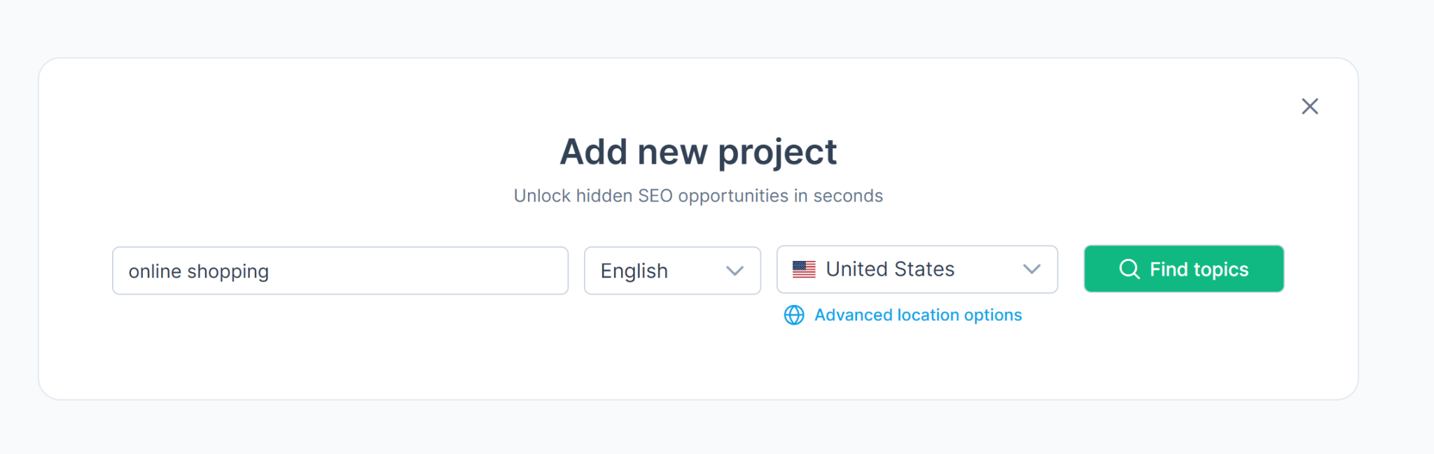 To get topic ideas, simply sign up for a RankDots account, click Add new project, enter your main keyword and hit Find topics:
